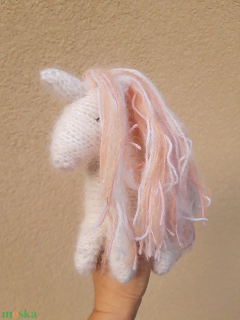 Fehér unikornis barackos-rózsaszínes-fehér sörénnyel gyapjúfonalból