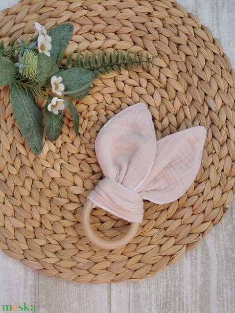 Nyuszifüles rágóka fa karikával - "Bézs duplagéz anyagból" UNISEX