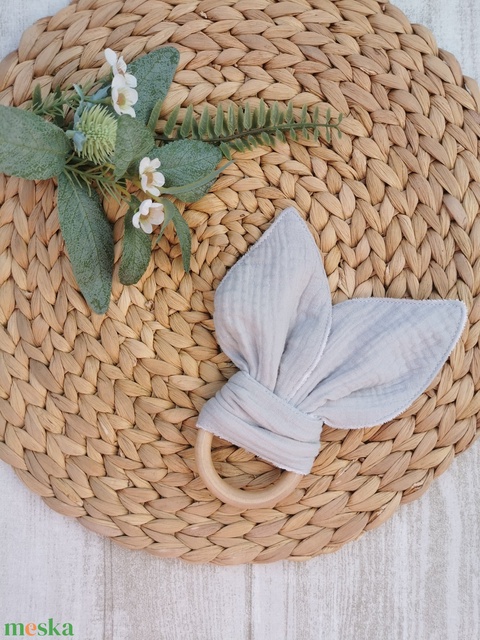 Nyuszifüles rágóka fa karikával - "Világos szürke duplagéz anyagból"