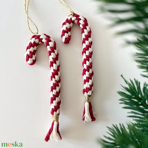 2 db piros cukorka karácsonyfadísz, páros karácsonyi makramé cukorpálca dekoráció