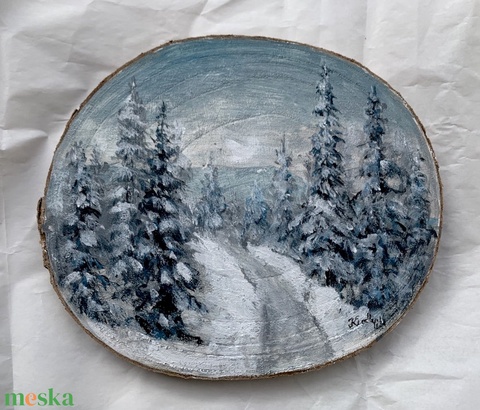 Síkos hegyi út - akrilfestékkel fakorongra festett kép