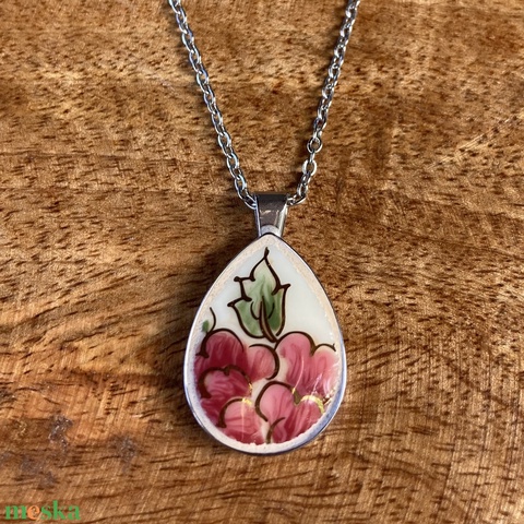 Zsolnay mentett darabok - virágos porcelán nyaklánc - nemesacél csepp medálos