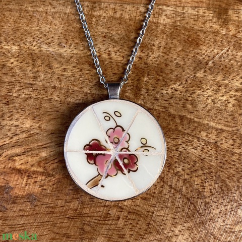 Zsolnay mentett darabok - virágos porcelán nyaklánc - nemesacél nagy medálos