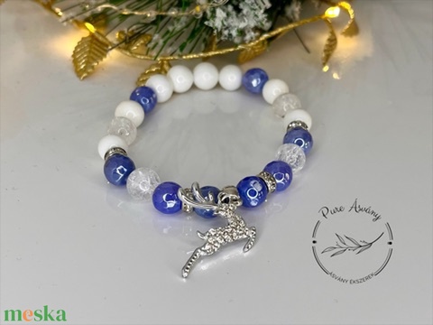 Kagyló – Galvanizált achát – Hegyikristály karkötő szarvas medállal