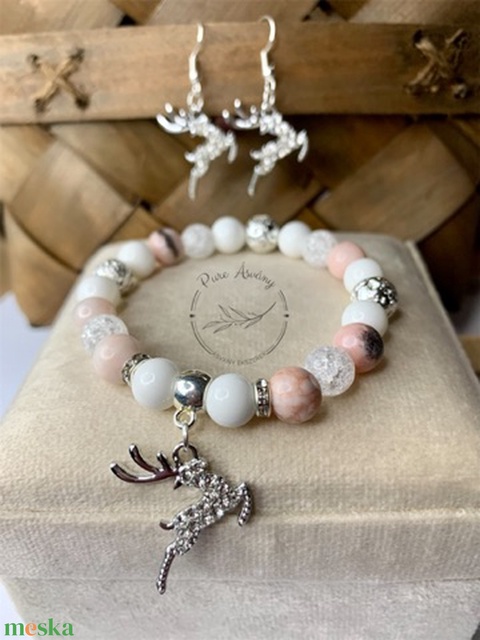 Pink zebra jáspis – Tejkvarc – Hegyikristály – Lávakő karkötő és fülbevaló szarvas medállal