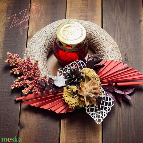 - Anyaga: szalmakoszorú, üveg, örök virágok