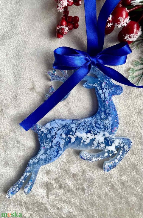 Kék szarvas gyanta dísz – kézzel készült karácsonyfadísz csillogó mintával és szatén szalaggal