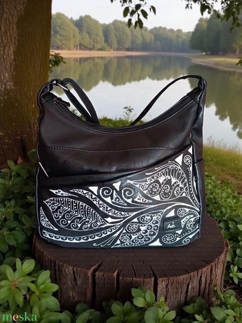 Sok zsebes, műbőr válltáska, kézzel festett, egyedi mintával