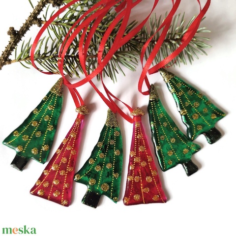 Zöld és pink fenyőfák, arannyal díszített üveg karácsonyfadíszek