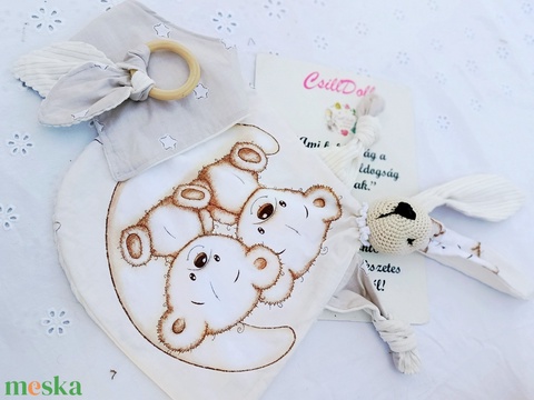Gyönyörű natúr Babaváró-Babaköszöntő ajándék szett maci mintával