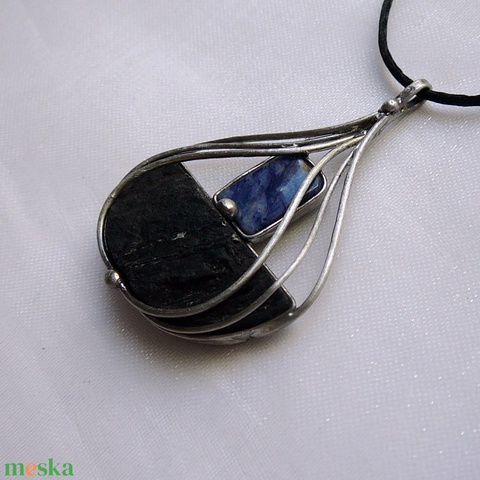 A medál Tiffany technikával készült nyars fekete turmalin ( sörl ) szodalit és ólommentes, ezüsttartalmú ón felhasználásával. A díszítés szintén saját készítésű, nem tartalmaz gyári elemeket. A fémrészt óezüstre patináztam, lekezeltem antioxidánssal és lelakkoztam, hogy sokáig szép maradjon.