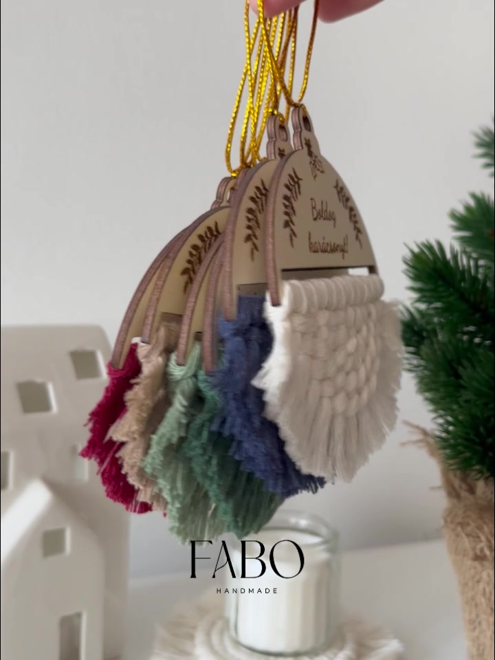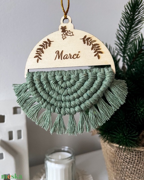 Egyedi, névre szóló kétoldalas makramé karácsonyfadísz, világoszöld színű fonalból, személyre szóló karácsonyi ajándék