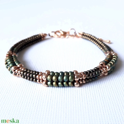 Patinás zöld árnylatok és arany, gyöngyös karkötő