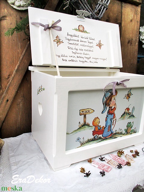 gyerekszoba bútorok, romantikus antikolt festéssel készült fa ajándéktárgyak a provence-i stílus jegyében