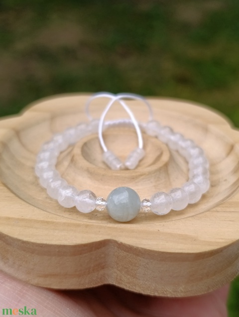 Akvamarin és hegyikristály csomózott karkötő és fülbevaló, a belső béke ékszere