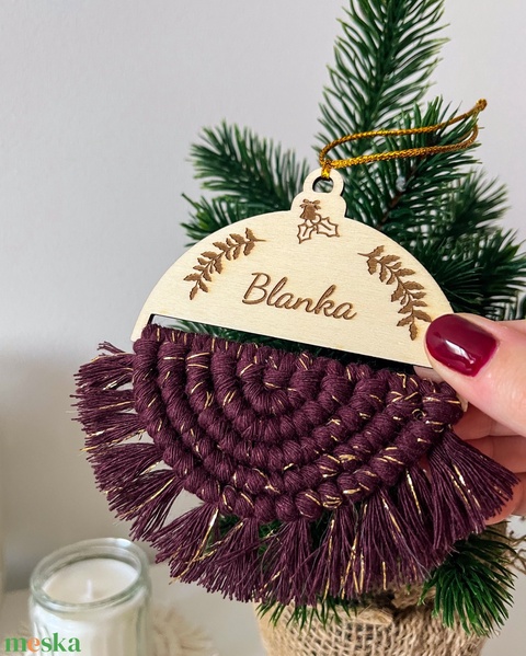 Csillogó, névre szóló makramé karácsonyfadísz, burgundi-arany színű fonalból, személyre szóló karácsonyi ajándék