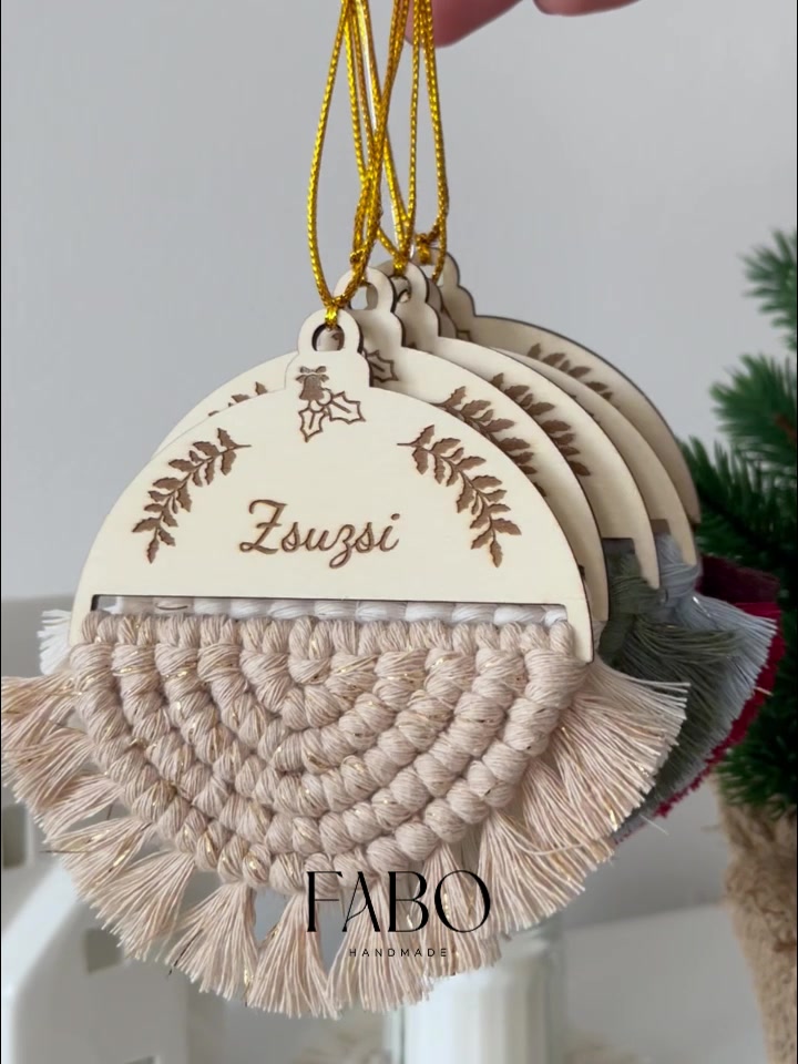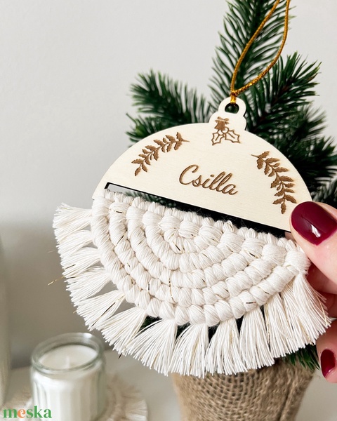 Csillogó, névre szóló makramé karácsonyfadísz, fehér-arany színű fonalból, személyre szóló karácsonyi ajándék