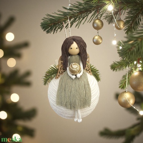 Makramé angyal karácsonyfadísz – fenyővel, fa szárnyakkal és ünnepi masnival