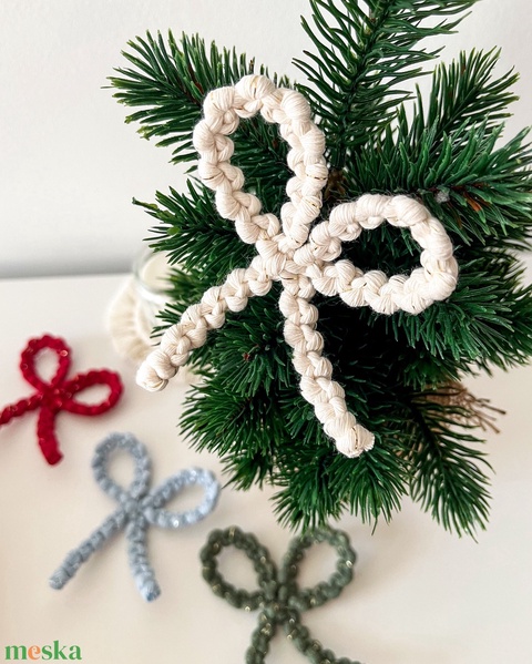 Színes masni karácsonyi dísz, ajándékkísérő, választható sima vagy csillogó makramé fonalból