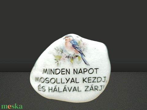 "Minden napot mosollyal kezdj, és hálával zárj!"Kő idézettel és madárkával.