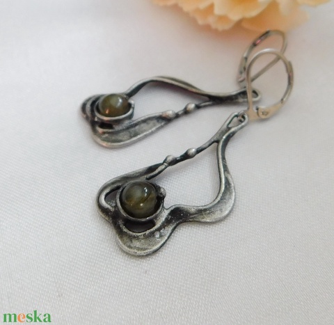 A fülbevaló tiffany technikával készült labradorit, réz és ólommentes, ezüsttartalmú ón felhasználásával. A díszítés szintén saját készítésű, nem tartalmaz gyári elemeket. A díszítés szintén saját készítésű, nem tartalmaz gyári elemeket.A fémrészt óezüstre patináztam és lelakkoztam, hogy sokáig szép maradjon.