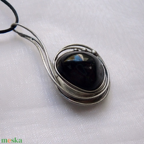 A medál Tiffany technikával készült fekete turmalin ( sörl ) és ólommentes, ezüsttartalmú ón felhasználásával. A díszítés szintén saját készítésű, nem tartalmaz gyári elemeket. A fémrészt óezüstre patináztam, lekezeltem antioxidánssal és lelakkoztam, hogy sokáig szép maradjon.