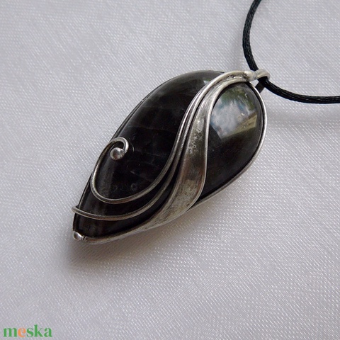 A medál Tiffany technikával készült holdkő és ólommentes, ezüsttartalmú ón felhasználásával. A díszítés szintén saját készítésű, nem tartalmaz gyári elemeket. A fémrészt óezüstre patináztam és lelakkoztam, hogy sokáig szép maradjon.