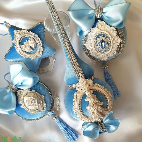 Luxus világoskék bársony karácsonyi díszek szettje – 4 kézzel készített elegáns fa dísz ajándékdobozban