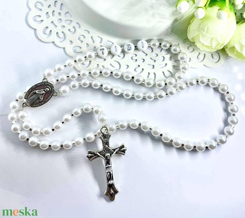Eszüst színű gyöngyös rózsafüzér névvel- kézmüves, személyre szabható ajándék keresztelőre vagy bérmálásra