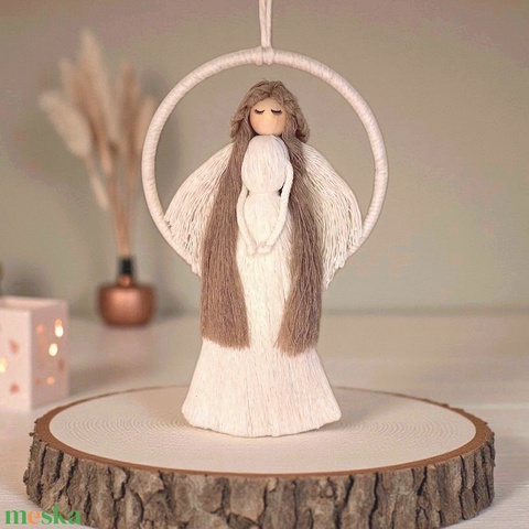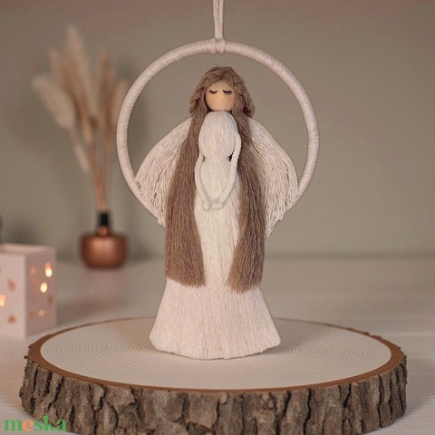 Makramé angyal falidísz – hosszú fehér ruhás, fonal szárnyas angyal makramé karikán