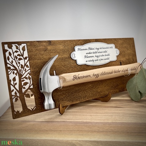Szülőköszöntő ajándék - gravírozott nyelű kalapács díszes fatáblával