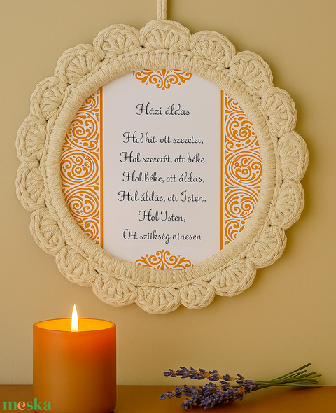 Házi áldás. Kézzel horgolt, természetes árnyalatú falikép a klasszikus “Házi áldás” szövegével.