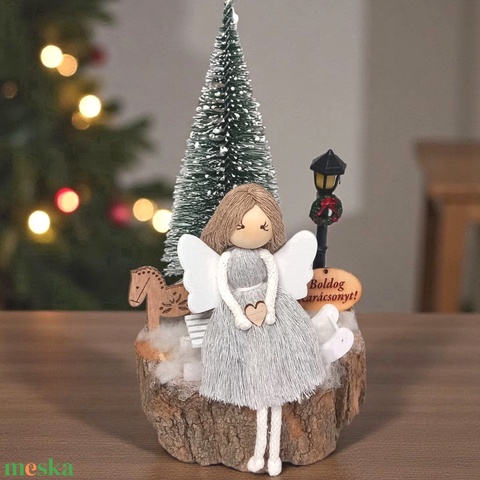 Makramé angyalka szánkón – karácsonyi asztaldísz fa korongon
