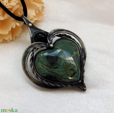 A medál Tiffany technikával készült kambaba jáspis (eldarit) és ólommentes, ezüsttartalmú ón felhasználásával. A diszítés szintén saját készítésü, nem tartalmaz gyári elemeket. A fémrészt óezüstre patináztam és lelakkoztam, hogy sokáig szép maradjon.