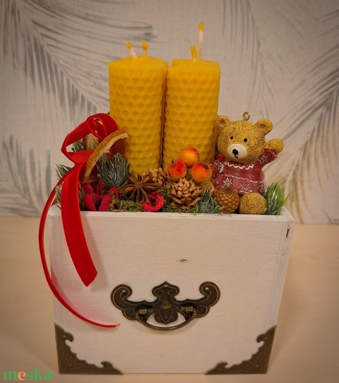 - Anyaga: faládika, méhviasz gyertya, termések, fűszerek, szárított almakarika, szárított narancskarika, tartós fenyő