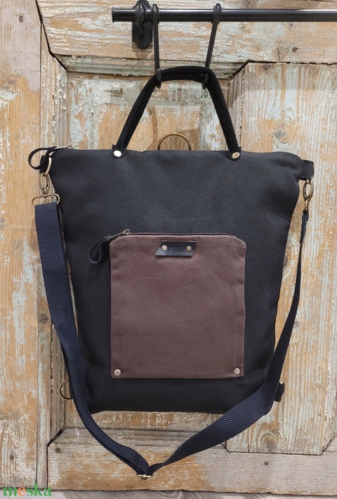 Fekete-barna vászontáska, Hátizsák, laptoptáska, iskolatáska, nyári hátizsák. A heveder egy mozdulattal levehető, akkor kézitáskaként használhatod!  Ezt a darabot kérésre készítettem, de neked is elkészítem, ha tetszik, akár más színből is!. Márete: magassága 40 cm  szélessége felül:34 cm alul :26 cm talpszélesség:6 cm Ha más színt, vagy méretet szeretnél, írj és megbeszéljük