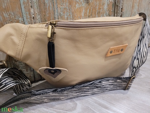 Tejeskávé pasztell táska.. Övtáska fazonú táska. Testtáska, válltáska, műbőr testtáska. Praktikus, könnyű viselet ez a műbőrből készült táska, elférnek benne az apróbb dolgaid, pl: telefon pénztárca. Városi sétához, kiránduláshoz rendkívül praktikus, könnyű, kényelmes. Bélése pamutvászon, egy cipzáras zseb található benne. Mérete:magassaga: 20 cm szélessége: felül 35 cm alul: 24 cm . Állítható párduc mintás hevederrel .