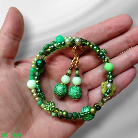 Üde zöld gyöngyös memoria karkötő és fülbevaló szett