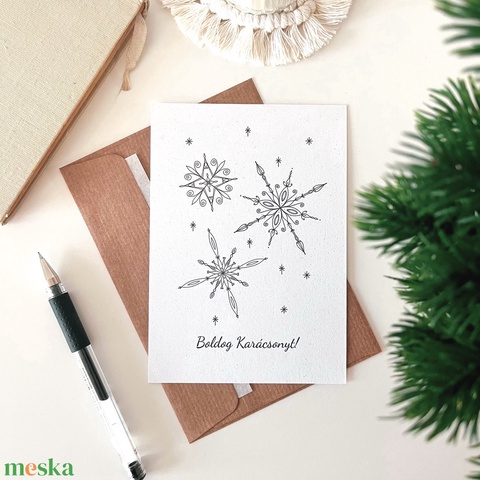 Karácsonyi képeslap hópehely mintával (A6-os), újrahasznosított papírra nyomtatva, borítékkal