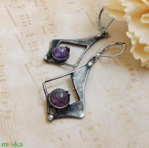 A fülbevaló tiffany technikával készült ametiszt gyöngyök, ólommentes, ezüsttartalmú ón és réz felhasználásával. A díszítés szintén saját készítésű, nem tartalmaz gyári elemeket. A díszítés szintén saját készítésű, nem tartalmaz gyári elemeket.A fémrészt óezüstre patináztam és lelakkoztam, hogy sokáig szép maradjon. Orvosi acél akasztókra tettem.