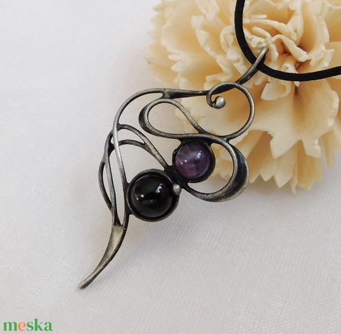 A medál Tiffany technikával készült ametiszt, réz és ólommentes, ezüsttartalmú ón felhasználásával. A díszítés szintén saját készítésű, nem tartalmaz gyári elemeket. A fémrészt óezüstre patináztam és lelakkoztam, hogy sokáig szép maradjon.