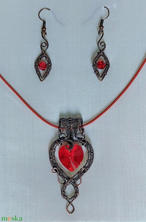 Vörösréz drótékszer szett piros swarovski kristályokkal