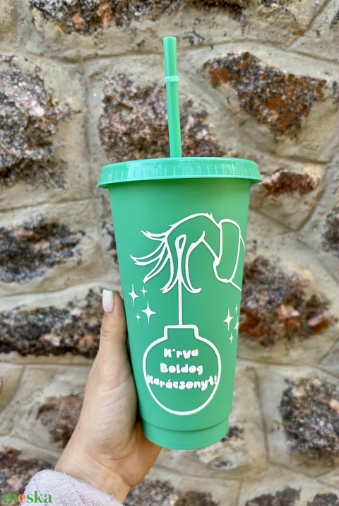 Vicces, Grinch mintájú pohár tetővel és szívószállal - 710 ml