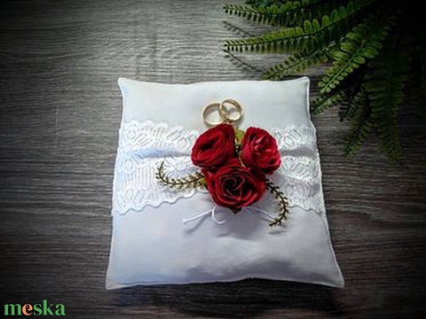 Fehér gyűrűpárna vörös élethű rózsákkal
