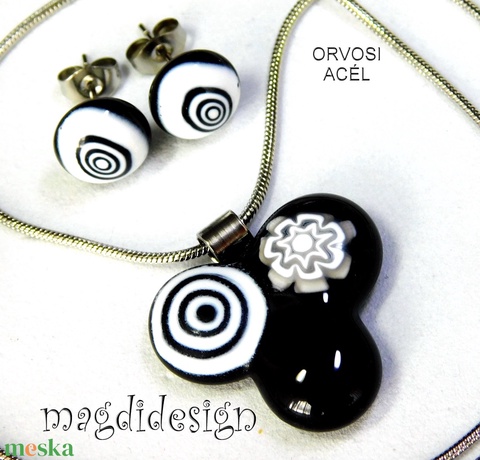 Fekete-fehér bogyós színtrió üvegékszer szett nyaklánc stiftes fülbevaló