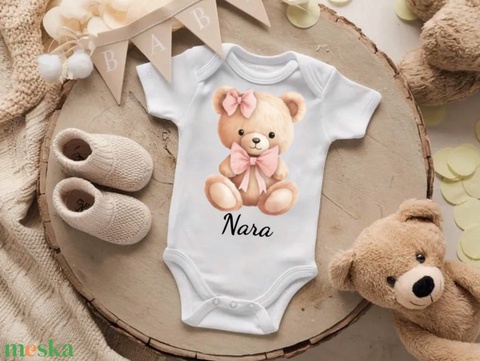 Névre szóló body, rózsaszín maci mintával, rövid/ hosszú ujjú