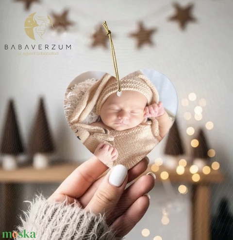 Szív alakú, akril fényképes, karácsonyfa dísz