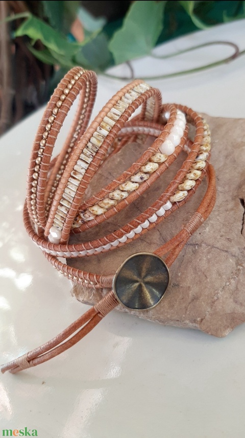 - Anyaga: bőr, gyöngyök, fém kapocs, bőrvarró cérna