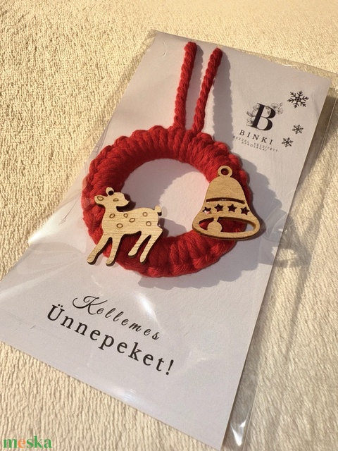 Piros színű makramé dísz. Kb. 7 cm átmérő. Fa díszekkel, ajándékcsomagolásban.