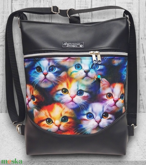 Szivárvány cicák Mosolyvonalas 3in1 textilbőr hátizsák oldaltáska Fekete alapon